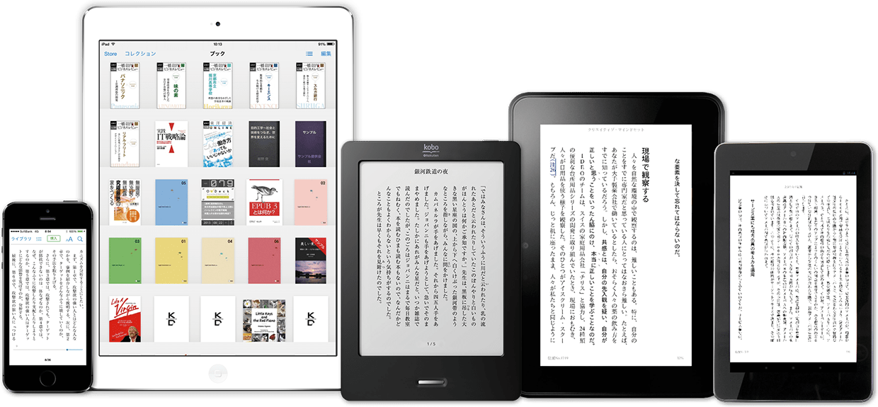 電子書籍はiphone・ipad(アップル)、android(グーグル)、kindle(アマゾン)など、多くの端末で読むことができる