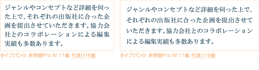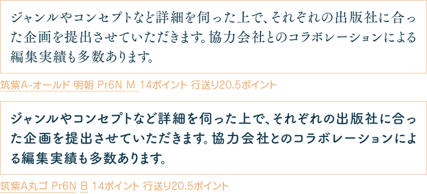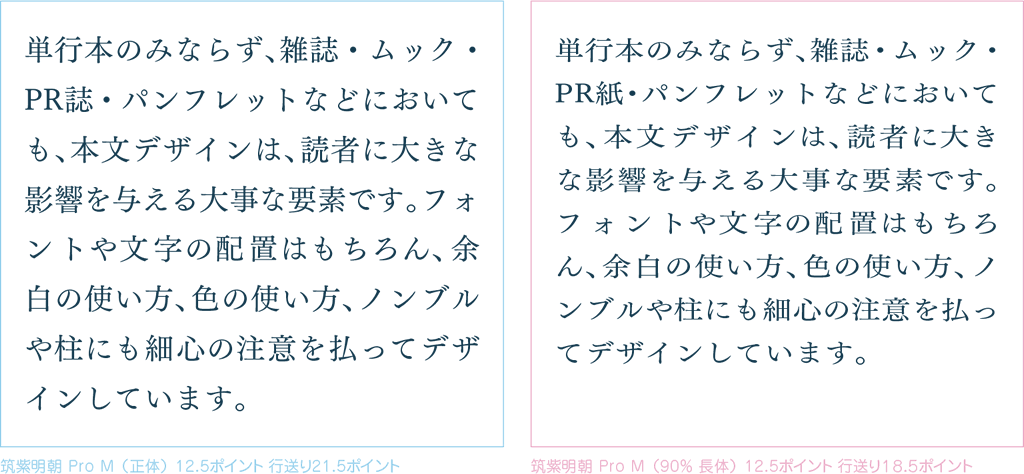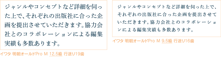 文字の読みやすさは、①書体とそのウェイト(太さ)、②文字サイズ、③行長、④行間の4つの要素で決まる。それぞれの要素を変更して、見え方を比較してみる。