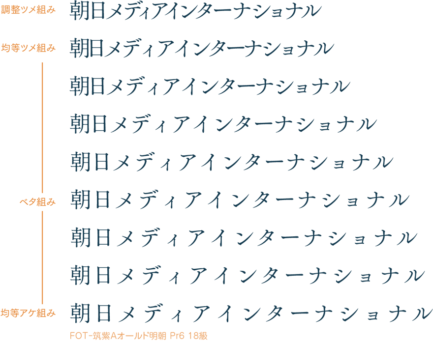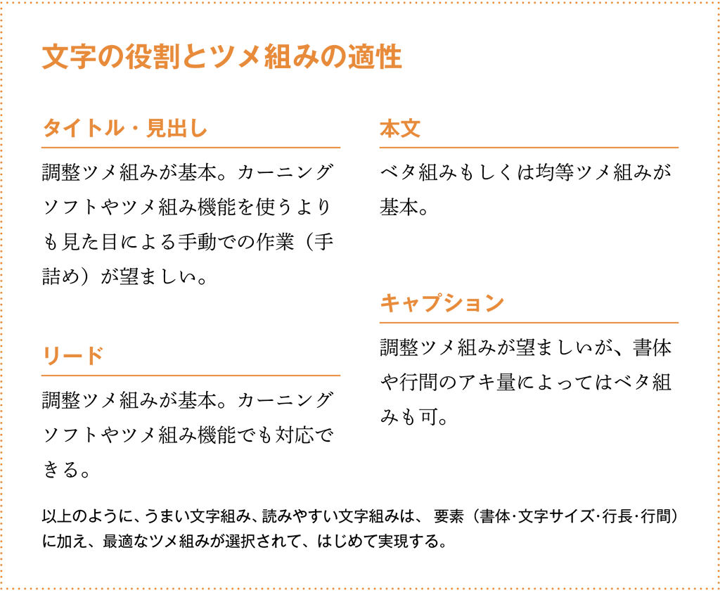漢字やかな、数字などが混在する和文組版では、組みの方向や書体でツメ量は変化する。和文では一般的にかなだけを詰めるが、もともとかなは縦書きを意識して設計されているだけに、あえて詰めることは多くない。むしろ横組みでのツメは必須。字面の異なる書体では、字間のスペースも大きく異なるからだ。