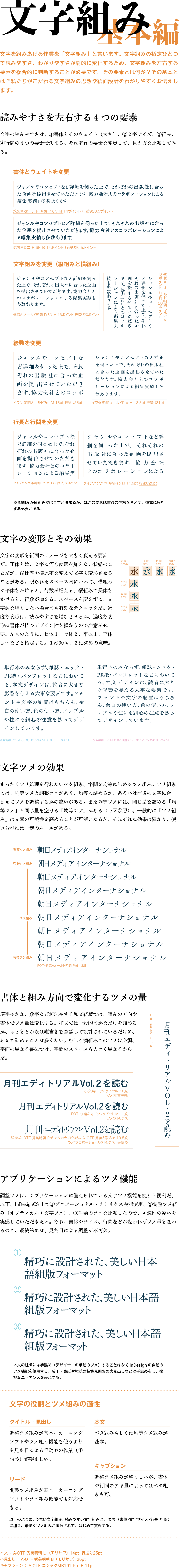 iPhone、Android、TPP、STAP細胞などアルファベットや英単語が日本語の文章に入ることは珍しくなくなりました。Wordで入力するときも、欧文は半角、和文は全角で入力するなど、欧文と和文の書体は作りや形が大きく違っています。その両者間に統一感を持たせ、違和感のない文字組みを作り上げるには、繊細な気配りと細かい作業が要求されます。今号は「和欧混植」の美しい組版の秘訣を紹介します。