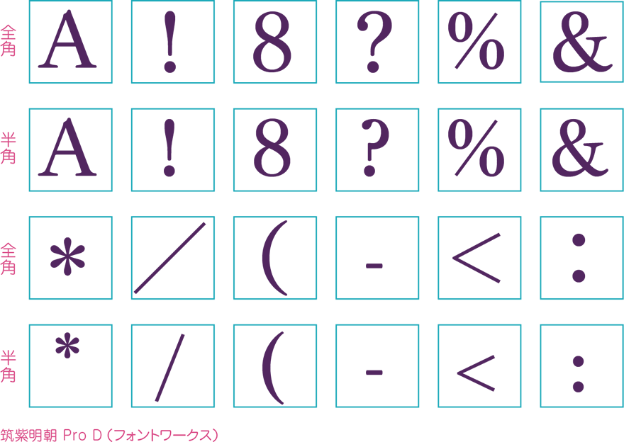 英字の多くの書体には全角英字と半角英字のデザインがある。全角は和文書体用に、半角は欧文書体用にデザインされているが、両者のデザインは大きく異なる。まずはその違いを確認してみる。