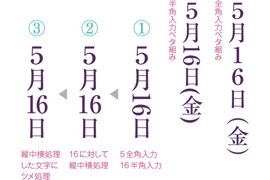 縦組み中、一桁数字は全角、二桁数字は半角で入力すると、上記①のようになってしまう。この場合は、②16に「縦中横」の処理をして転がってしまった文字を起こす。美しくみせるためには、③ツメの処理も必要。なお、このツメの処理はGREP(正規表現)機能を使用しデザインをもとに自動で一定のツメを行う。