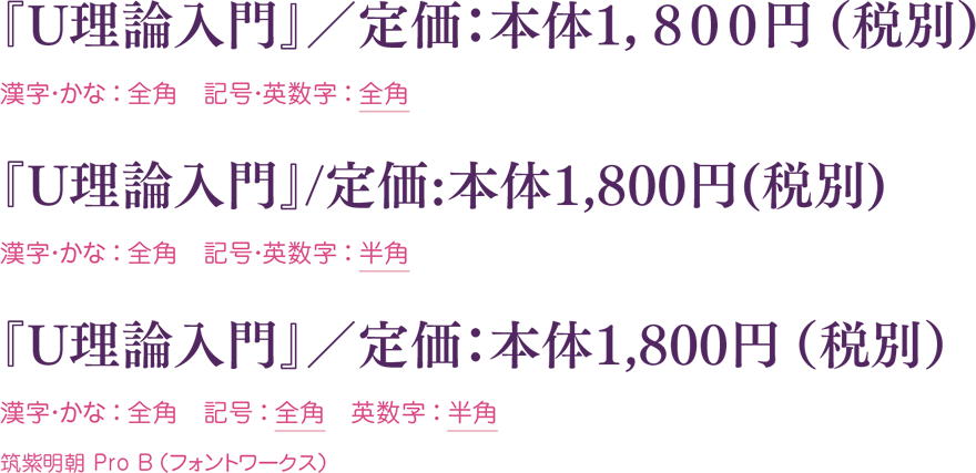 漢字・かな、英数字、記号を、全角・半角を使いわけした例を提示してみる。和文・欧文のバランスがよいのは「漢字・かな:全角 記号:全角 英数字:半角」のパターンだ。原稿作成のときにも気をつけたい。