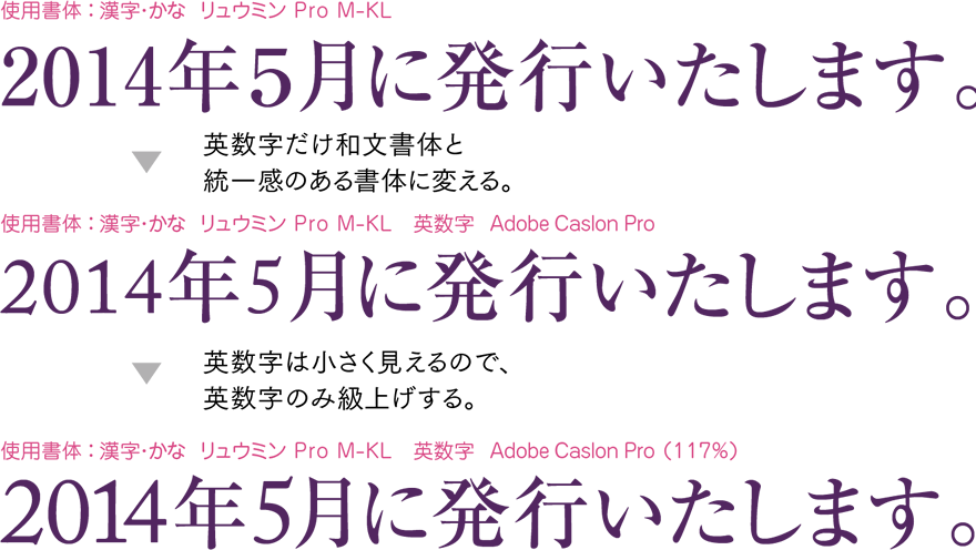 欧文書体が決まったら、その書体のベースラインなどにも留意し、大きさを決める。英数字だけを級上げすると美しく見える。