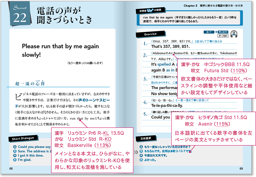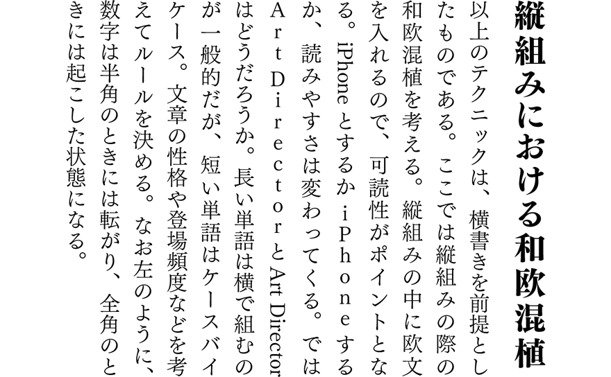 従属欧文は「b」や「y」などの上下に突き出た部分を縮めたり、和文に、合わせるための字形調整が行われているため「図表A」のような記号的な使用には向いているが、「Art Directorになる」のような英単語には不向き。本文中に長めの欧文が入る場合は、別の欧文書体を組み合わせることが多い。下は、弊社が担当させていただいた組版例。各部分の書体を明示する。和文・欧文書体の組み合わせや欧文書体の大きさ(%)に注意してみていただきたい。