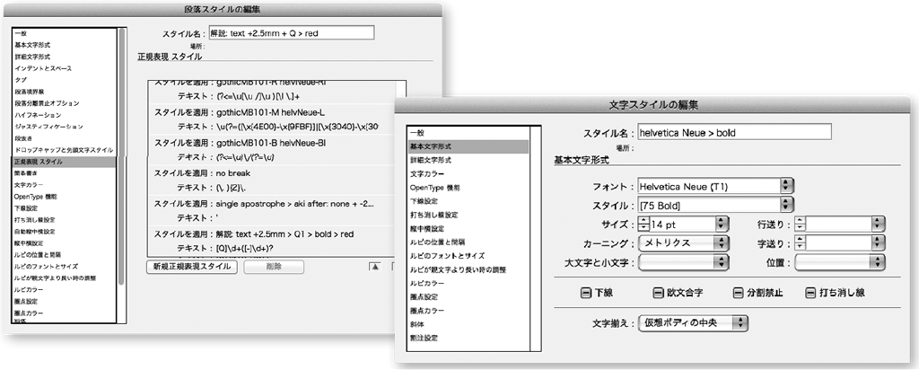弊社ではさらに高度な設定が可能なGREP(正規表現)機能を使用しレベルの高い混植を行っている。フォーマットをデザインする際にも多用している。