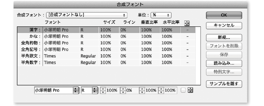 InDesignには「合成フォント編集」機能で、和欧混植の設定ができる。