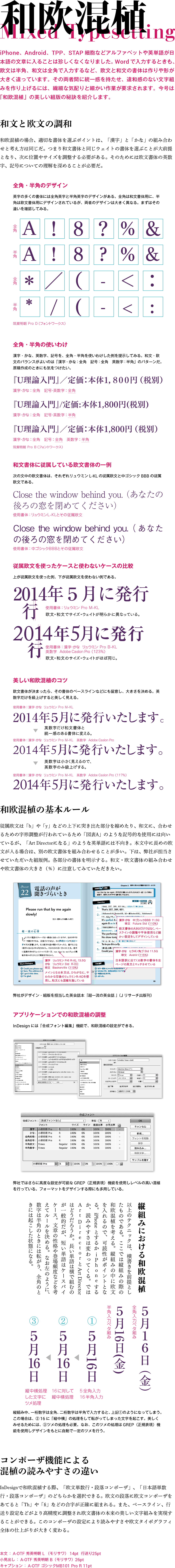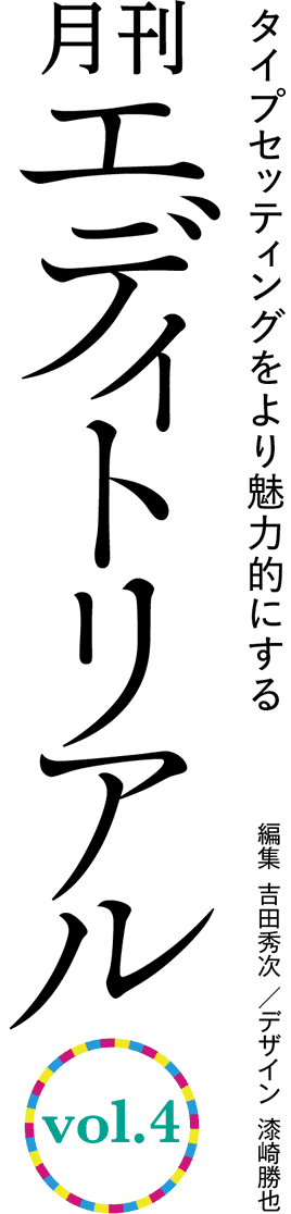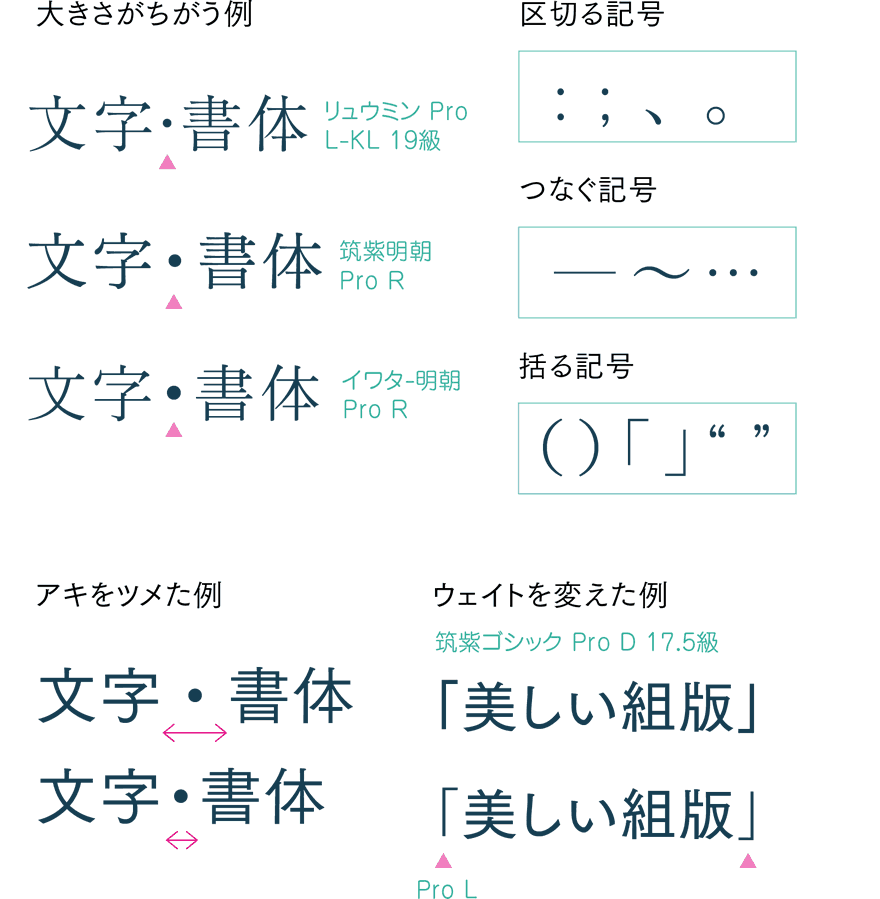 記号・約物には、「区切る記号」「言葉を括る記号」「文章の前後をつなぐ記号」などがあるが、それらはすべて文章を読みやすく、また、わかりやすくするために使われている。書体に従属するこれらの記号は、書体によっては、大きさや太さが、文字(漢字・かな)と揃っていないことがある。このときは、記号の大きさを変えたり、ウェイトを変える、アキをツメるなどの処理が必要だ。 記号や約物にも細心の注意を払ってデザインしないと、読者に違和感を与えることになる。たかが記号・約物と考えてはいけない。特に、タイトルや見出し、メインコピーのような「見せる要素」の強い箇所では、アキをツメて全体にまとまり感を出すのが一般的だ。 ※約物の種類は、前号参照。