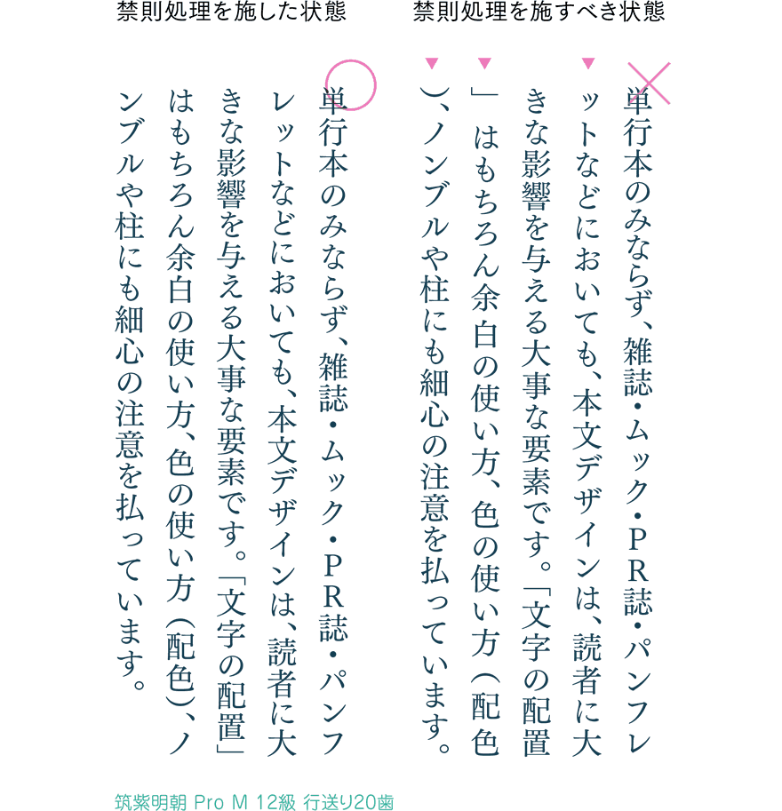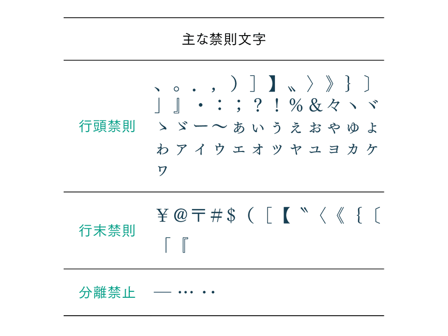 禁則とは、行頭や行末にふさわしくない約物や文字が配置されないように調整すること。「、」や「。」「}」「…」などが行頭にくると、約物本来の「区切る」「括る」「つなぐ」の機能から離れるので、ふさわしくない。また、「っ」や「ゅ」などの拗促音や、「ー」(音引き)も、好ましくないと考えられ、禁則の対象になっている。特に行頭に「ー」(音引き)がくると、横組の場合、書体によっては、漢数字の「一」にも見えるので注意が必要。 「(」などの起こしのかっこ類が行末にくることも禁止されている。「……」などのように同じものを2回続けて使う場合は、分割されないように処理する必要もある。