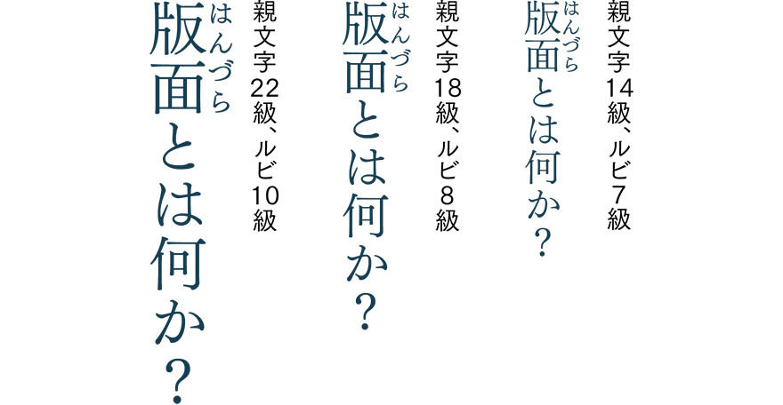 親文字が16級以上になると、ルビが大きく見えすぎるので、2分の1より、やや小さくする。