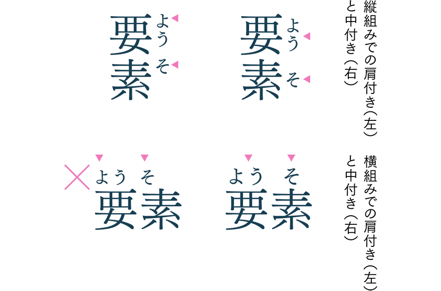 ルビをふる際には、位置も検討する。親文字の上側を基準にする「肩付き」と、親文字の中心を基準にする「中付き」がある(ただし、横組みでの肩付きはルール違反)。