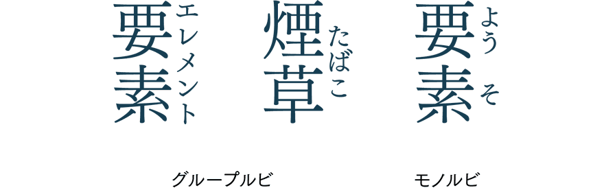 漢字ごとにルビをふることを「モノルビ」、単語全体にルビをふることを「グループルビ」と言う。欧文の読み方を示す場合や、読みが一音一語に分かれていない場合は、グループルビを使うことが多い。