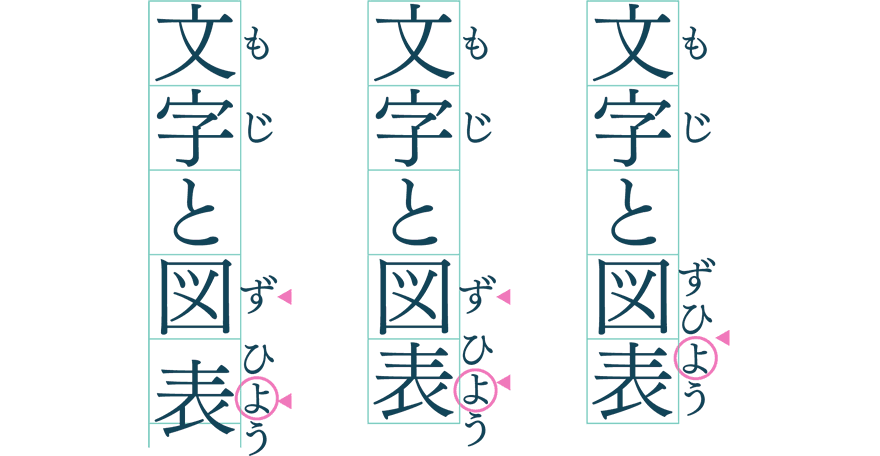 左は、「表」のルビを前後に広げている。中央は、一語ずつ振り分けている。右は、「図表」を一括りにして、ルビをふっている。最近では抑促音を小さくするケースも多い。