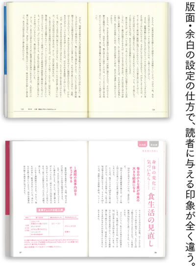 可読性、読みやすさをもっとも優先して版面を設計するが、誌面(レイアウト)の美しさも考慮しなければならない。たとえば、上品にするという意図で余白を広くとったり、または、情報が沢山つまっているような印象を版面の大きさに反映させることもある。その要素となるのが、書体の形、ウェイトからくるアキの詰まり具合、どれだけ小口・天・地の余白を持たせるか、である。書籍(雑誌)のジャンルやイメージも版面設計やレイアウトに大きく影響する。