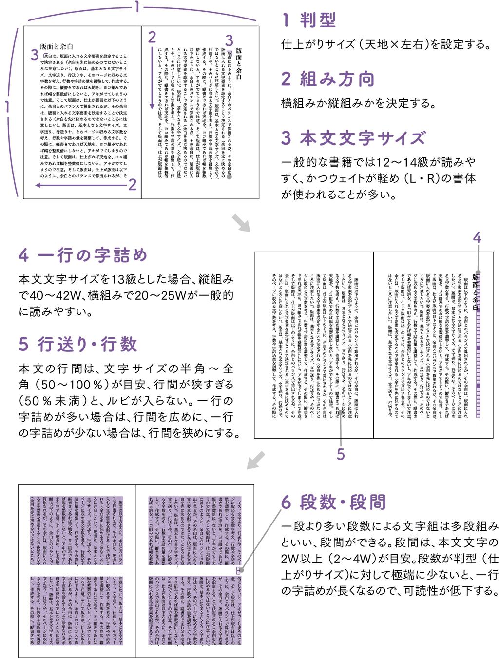 版面を決定するためには、想定読者の年齢層・性別や読ませたいイメージ、媒体の特徴などを考慮し、(1)判型(2)組み方向(3)本文文字サイズ(4)一行の字詰め(5)行送り・行数(6)段数・段間などの要素を確定させる必要がある。