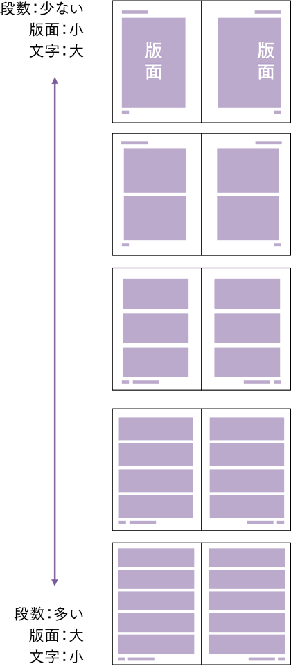 段数が少ないと、行長が長くなり可読性が低下するため、一般に版面は小さくなり、文字は大きくなる。逆に、雑誌やムックのように多段組みの媒体は、版面は大きく行長が短いため、文字は小さめでも可読性は保てる。