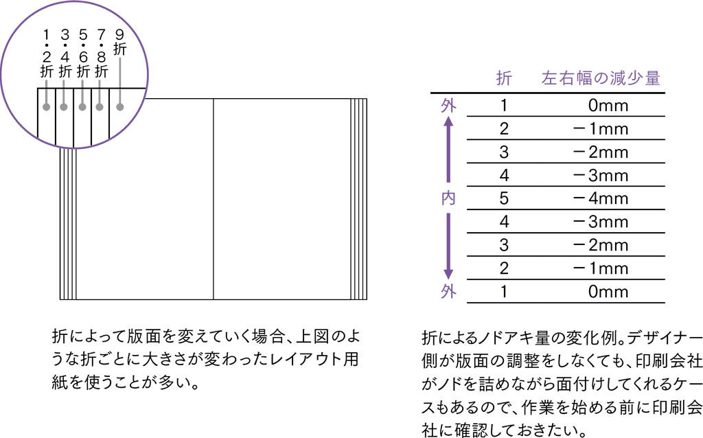 中綴じは、背がないため開きがよい。ノドのアキが狭くてもレイアウトが見やすいうえに、ノドを意識しないで、見開きの全面を一枚の紙面として考え、自由にレイアウトすることもできる。ただページ数が多いと、折によってズレが生じるので、上記のような調整が必要。 そのような場合は、一般的には小口側が断裁されないように、仕上がりサイズを短くしたり、版面をノド側に寄せたり、版面を狭くするなどして対応する。 いずれにしても、事前に束見本を作って、折ごとの仕上がりサイズを確認したい。