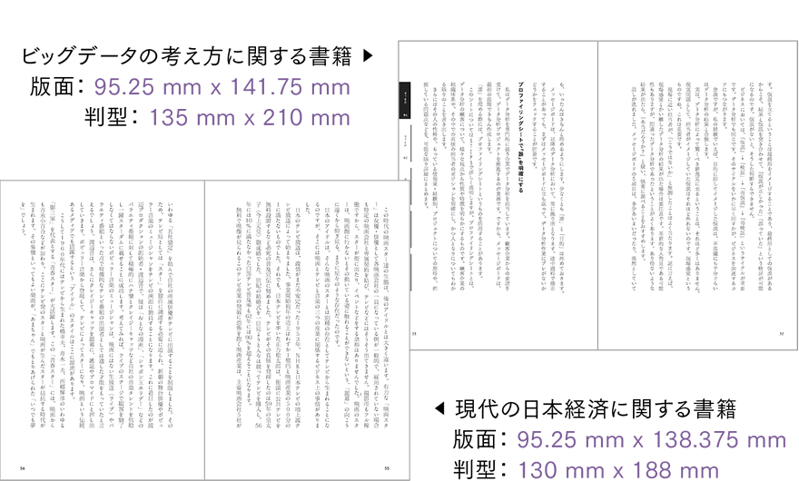 ペ版面は右の例のように、余白とのバランスで算出されるが、その余白は、版面に入れる文字要素を設定することで決定される(余白を先に決めるのではないところに注意したい)。版面は、基本となる文字サイズ、文字送り、行送りや、そのページに収める文字数を考え、行数や字詰め量を調整して、作成する。その際に、縦書きであれば天地を、横組みであれば幅を整数倍にしないと、アキがでてしまうので注意。そして版面は、仕上がりの紙面サイズと縦横比が同じとなる相似形が望ましい。