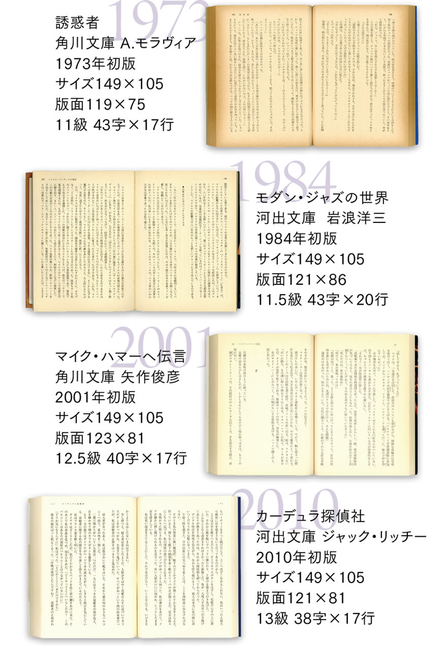 一冊ごとに異なる版面の設定だが、時代による大きな流れもある。左の四つの例から級数と一行の字詰めに注目すると、文字サイズは大きくなり、一行に入る文字数が少なくなっていることがわかる。