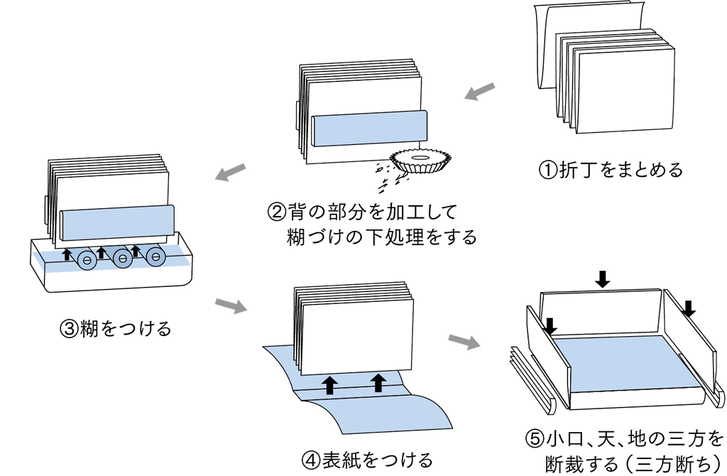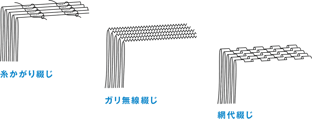 綴じ方には大きく分けて、「無線綴じ」と「糸かがり綴じ」がある。「無線綴じ」とは、接着剤以外のもの(糸など)を使わずに綴じる方法。強度を増すために、接着剤に触れる表面積を増やす切り込みを入れる。 他方、「糸かがり綴じ」は、文字通り糸でかがる方式。折り丁単位で印刷された本文に背側から小さな穴を開けて、そこにかがり糸を通し本文を固定する。折丁どうしの接着が、かがり糸が横糸を一周することで固定するほか、糸でかがった上から接着剤でさらに固定する。最も強力な綴じ方だが、無線綴じに比べ手間がかかる。 「網代綴じ」は、針金や糸類を用いず接着剤のみで本文を固定する点は無線綴じと同じ。ただ、無線綴じと異なるのは、折丁印刷した本文に外側から背と平行に切り込みを入れて、折丁内の本文を露出させ、本文内部も一回の接着で固定する。糸かがり綴じと無線綴じの中間のような綴じ方。現在は、この方法が主流。 「ガリ無線綴じ」は、背の前面を削ってそこに接着剤を流し込む方法。他の方法に比べ強度が劣るが、安価に仕上げられる。