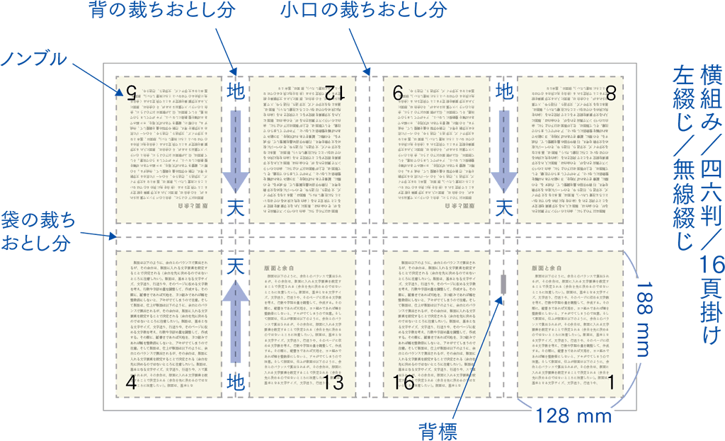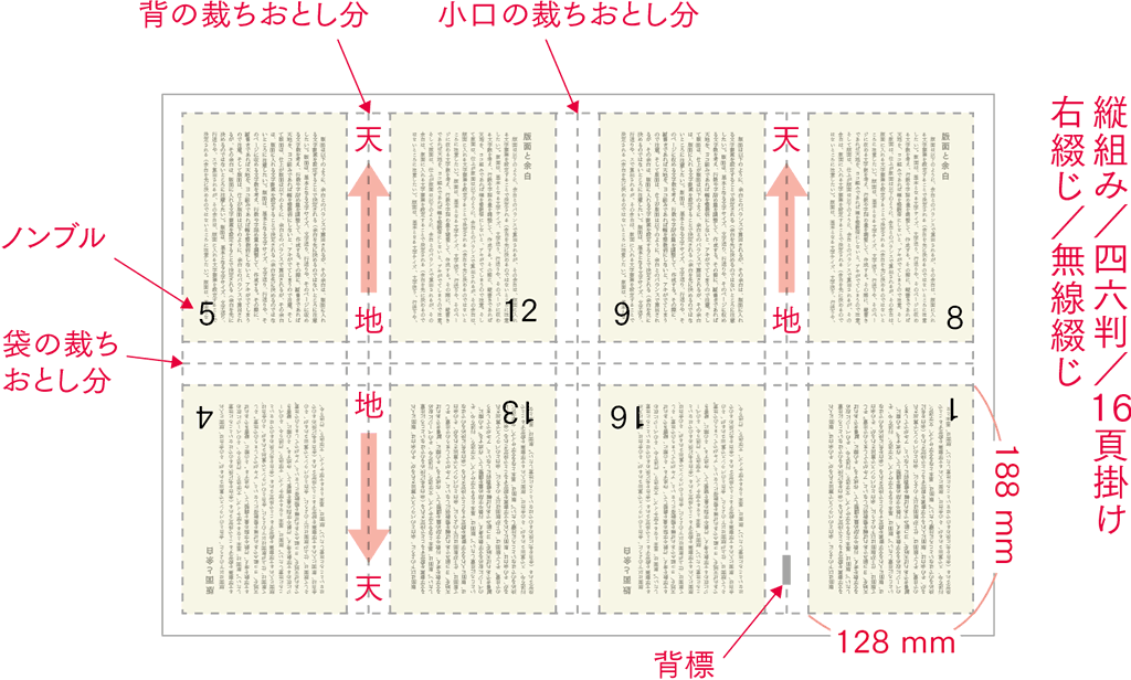 書籍を製本する場合、折ごとに(例えば16ページをひとつの折として)大きな紙に印刷して、それを折り、いくつかの折を重ねて製本するという工程を経る。綴じ方によって、ページをどう配置するかが決まる。