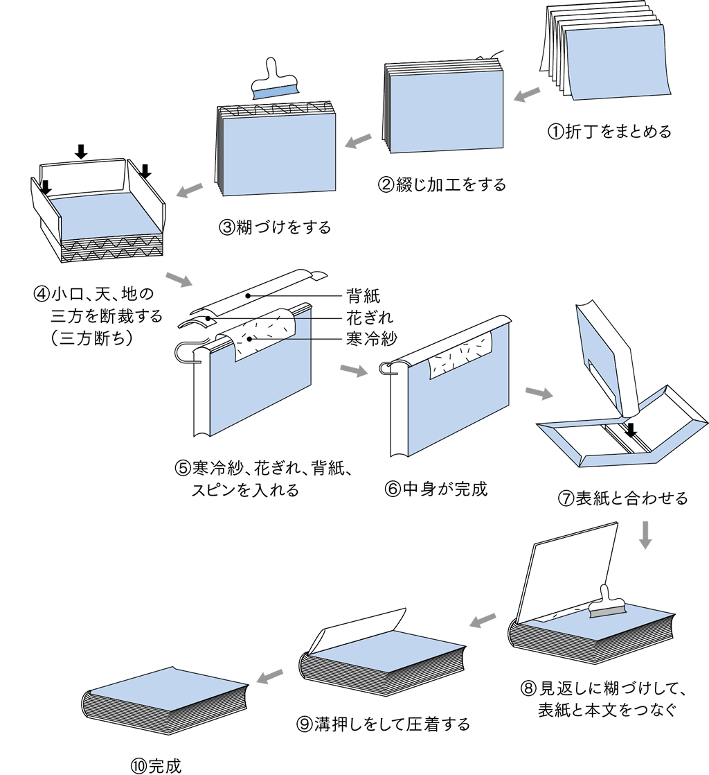 製本の方法は、「上製本(ハードカバー)」と「並製本(ソフトカバー)」にわかれる。上製本は、本文の用紙サイズよりもひとまわり大きい丈夫な板紙が入った表紙でくるむのに対して、並製本は文庫や新書のように、表紙と本文用紙サイズは同サイズになる。 上製本は、表紙は芯紙を布クロスや紙クロスでくるみ、丸背や角背で仕上げる(左下参照)。長期の保存に耐えられるのが大きな特徴で、事典・小説・写真集・記念誌などの製本に用いられることが多い。 一方、並製本は一般的にホットメルトという接着剤を使用し、中身と表紙を同時にくるみ、三方を仕上げ裁ちしたもの。上製本に比べ工程・資材が簡略化されているため、加工時間・コストとも低く抑えられる。