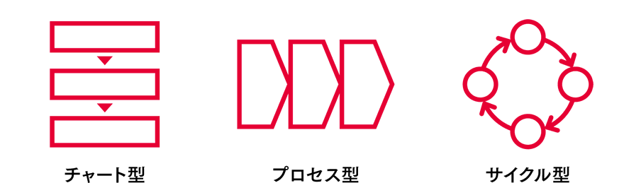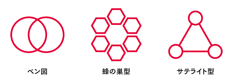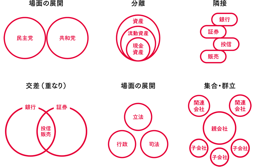 弊社では、図や表やグラフなどを総称して「図版」と呼んでいますが、特に図の使い方に気を使っています。 図の最大の特徴は、「全体像」と「部分同士の関係」をひと目に見渡すことができることにあると考えています。「全体」と「部分」が目に見えて、その関係がわかることが大きなメリットです。文章では記憶に残りにくいことも図があると印象が鮮明になったり、想起しやすくなったりすることがあります。文章を読みながら、数ページにもわたってその内容を記憶し続け、頭の中で全体を構成するのは難しいことです。そんなときに、図が使えないかどうかを考えます。 図の基本となるのが「マル」と「矢印」です。ものごとを図で説明する場合は、ほとんどの関係はマルと矢印で表現することができます。多く使われるのは以下の6パターンです。それぞれの役割を確認してください。