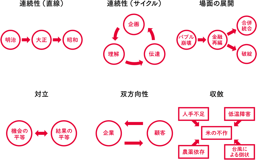 イラストとの違いというと、論理性があるかないかです。図版で表現するのは、「関係づけ」です。文字で書かれた内容から項目や事象を立体的にとらえ、多面的に実態を把握する力といってもいいでしょう。他方、イラストはイメージを鮮明に伝えたい場合に有効です。これも文章では伝えられない部分と言えるでしょう。ただ、イラストはイメージを伝えやすくする反面、具体的な描写の場合は、相手に先入観を持たせてしまう危険性もあるので要注意です。