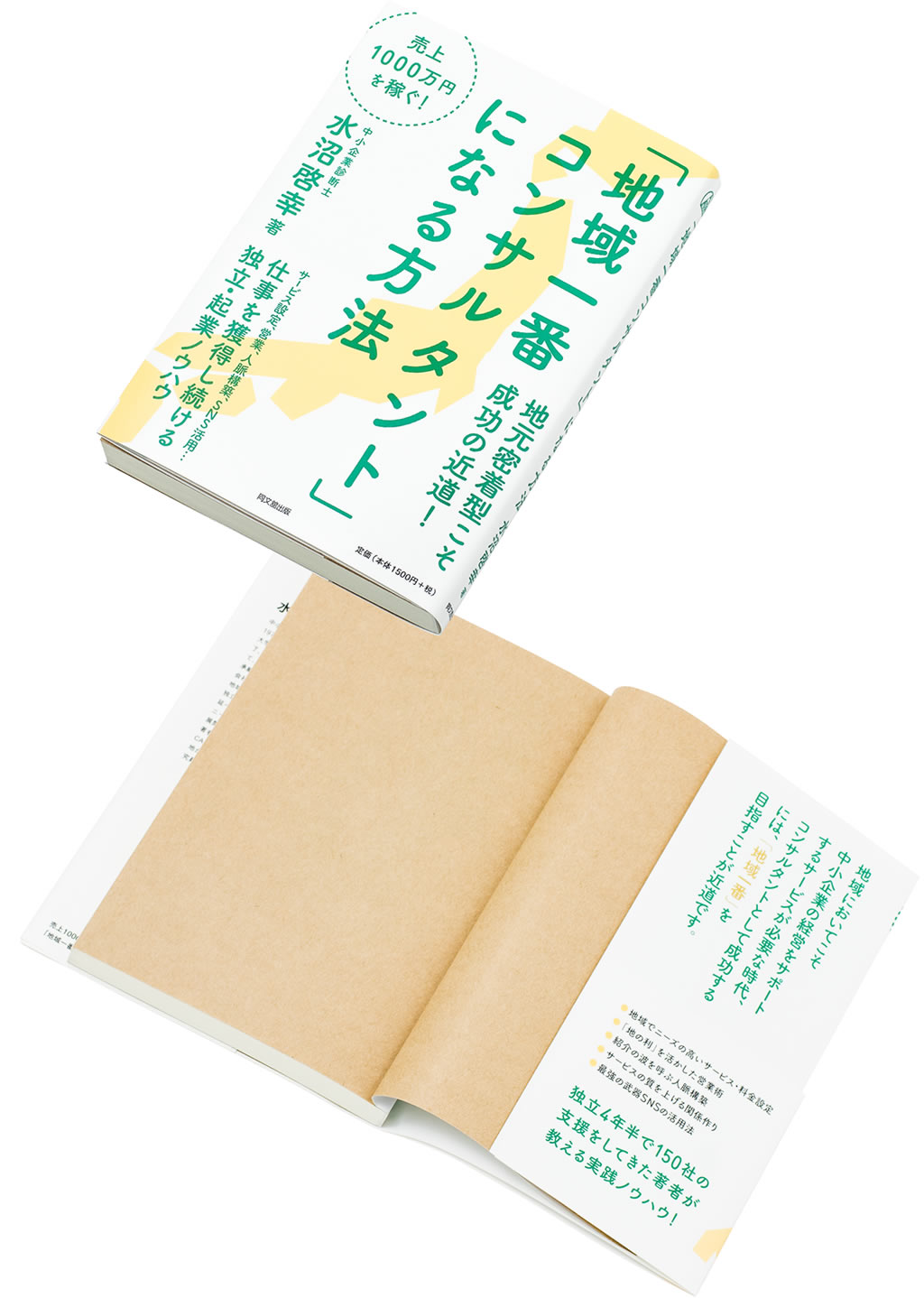地域においてコンサルタント業を成功させる方法が書かれている。テーマの「地域密着型」というビジネス書でありながら柔らかな印象という点にフォーカスし、緑・白・クリーム色を配色、書体には“筑紫A丸ゴシック”という丸いエッジのものを用いた。見返しには“クラフト紙”を選定し、カバー同様、やさしいイメージを演出した。