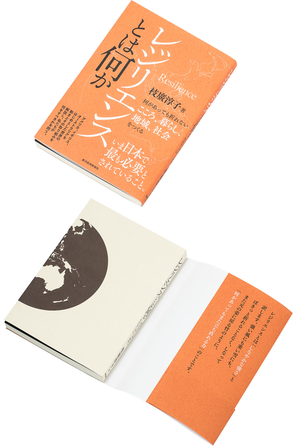 現代社会で必要とされている「レジリエンス(しなやかな強さ)」と、絶対的な地球の大地のイメージを関連付けている。地表を表現するため、エンボス加工された“タントセレクト”という用紙をカバーに選定し、読者が手触りでもデザインを楽しめるようにしている。