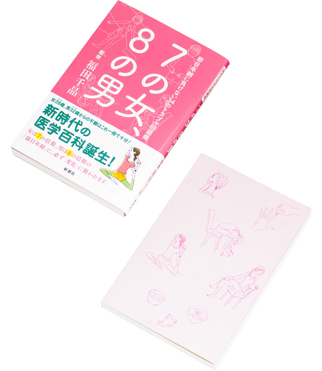 福田千晶監修の健康系の著書。ブックカバー、表紙、本文フォーマット、図版、すべてのアートディレクションを担当。本文には、読みやすさとわかりやすさを追求した書体や配色で、スッキリした印象のレイアウト。カバーに落ち着いた彩度のピンク色を大きく配色し、さらに白と緑で全体的にやわらかな印象のデザインしている。