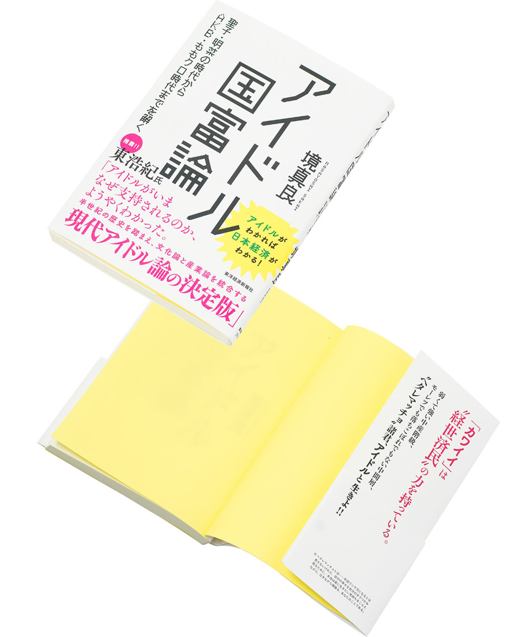 アイドルと日本経済の関係性を題材にした境真良氏の著書、装丁と本文フォーマットのデザインを担当。アイドルが持つポップなイメージと、日本経済というシリアスなイメージを両立させたデザイン。タイトルにデジタルな印象を与える書体を使用し、アイドルが注目されている現代(=インターネットメディアの現代)を表現した。