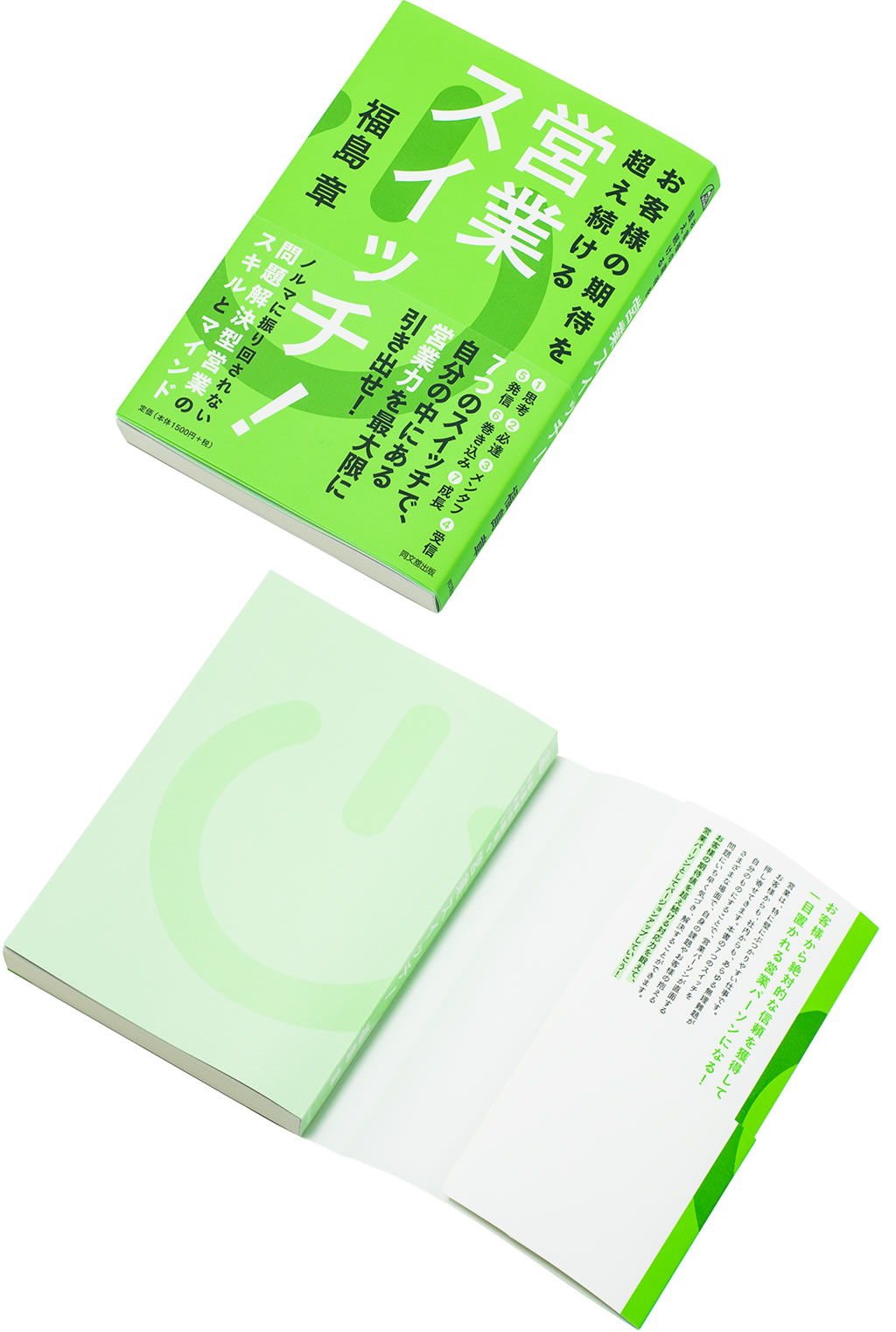 営業コンサルタント福島章氏の著書。装丁を担当。電源のアイコンをカバーの全体に配置しインパクトのあるデザインになっている。印刷には“蛍光インキ”を使用しスイッチが光っているよう演出している。また、地色とタイトル明度差を大きくしまずタイトルが目に入ってくるようデザインした。