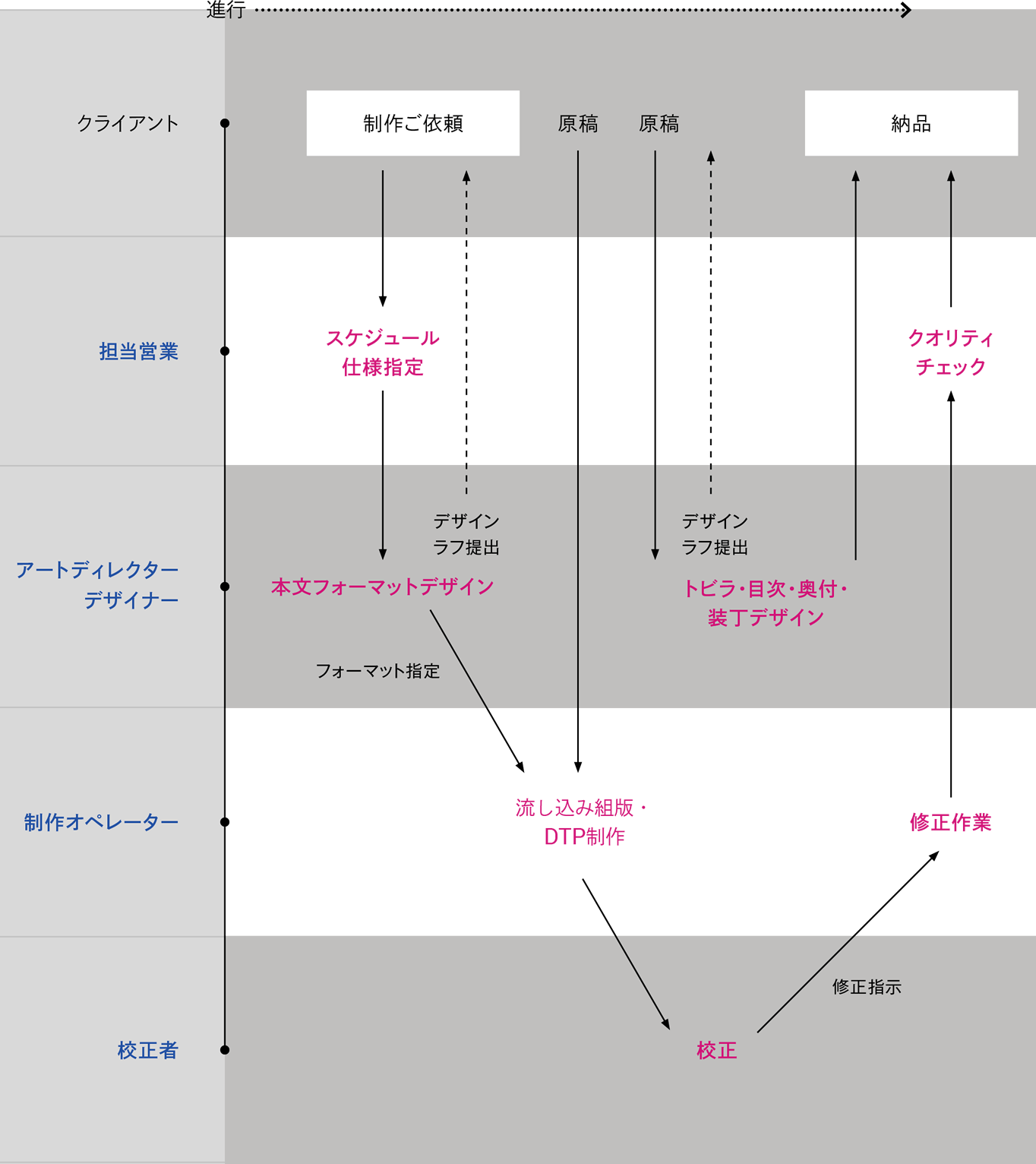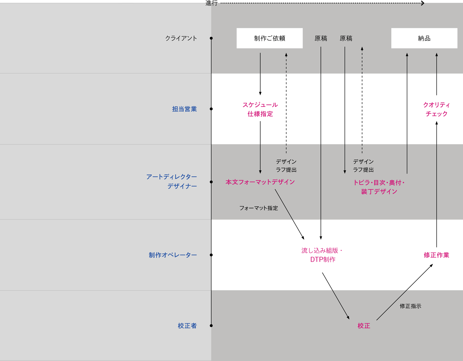 書籍・ムック・雑誌のご依頼を受け、納品まで全ての行程を効率よく分業し、それぞれの専門家(営業(プロデューサー、ディレクター)アートディレクター、デザイナー、校正スタッフ、DTPオペレーター)がそれぞれ担当し連携します。書籍まるまる一冊を弊社のアートディレクターがデザインの面で監督し、オペレーター、デザインスタッフがそのガイドラインに沿い全ページをデザイン制作します。営業はその進行管理(スケジュール管理)および経理面を担当し、校正スタッフは依頼いただいた原稿・素材がすべてクライアントの指示通り・規定通りになっているかを再チェックします。これらを全ての過程を分業することにより、よりクオリティーが高く、編集者に負担をかけない、ムダな修正指示が発生せず、むしろ初校戻しではクオリティ・クリエイティビティを追求する為だけの修正指示をいただくような制作体制を実現しております。このノウハウは他の様々な制作業務(フリーペーパー、自費出版、社内報、会社概要、カタログ、チラシ、ポスター、ウェブ制作)に活かされ、それがまたメインにあたる出版関係の制作業務にフィードバックされ、弊社の可能性は現代のデザインの需要と同時に常に広がりつつあります。
