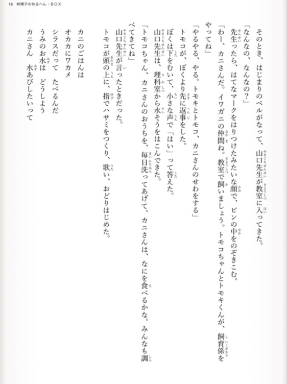 トモキは隣の席のトモコに悩まされている。だって少しもじっとしていないにぎやかな子なんだ。おまけに二人でカニの飼育係になってしまった──学校の中にはいろんな子がいていいのさ……