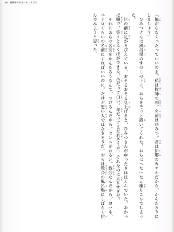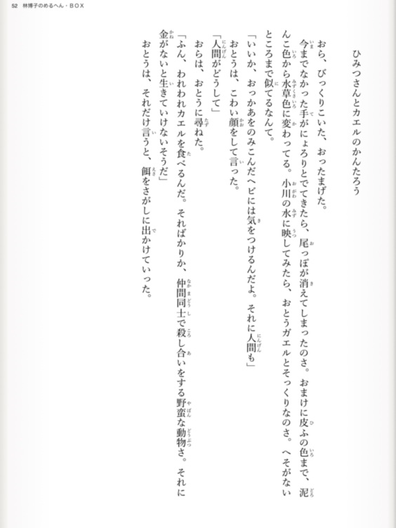 第五回伊那谷童話大賞の佳作を受賞したこの「ひみつさんとカエルのかんたろう」は、「林博子のめるへん・BOX」に収められています。七十余年の人生を歩んできた著者の珠玉の短編集も、どうぞご覧ください。