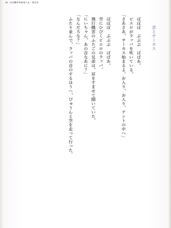 『雲とサーカス』は、サーカス一座に入った飛行機雲の兄弟と羊雲の姉妹たち、そして入道雲のてんやわんやのお話。一座にはちょっと迷惑なんですけど。