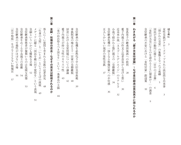 「日本の国は、これから皇室をどのようにしていこうと考えているのだろうか。それは、日本の伝統とも深くかかわる重要な事柄なのである。現在、皇室をめぐってさまざまな問題が起きている。とくに皇族の数の減少は深刻で、将来において皇位継承がつつがなく行われるかどうかについて、大きな不安が生まれている。本書では、近年における皇室をめぐるさまざまな話題を取り上げつつ、そうした事柄が生じてきた背景を明らかにすることをめざした。そのなかでは、女性皇族のことが極めて重要な事柄として浮上してくるはずである」――〈はじめに〉より